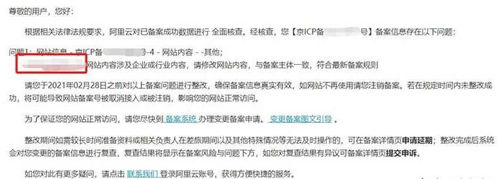 經核查您的[京ICP備xxxxxx號]備案信息存在問題:,網站內容涉及企業或行業內容,請您于2023年12月28日之前修改網站內容,對以上備案問題進行整改,與備案主體一致,確保備案信息真實有效,符合最新備案規則,如網站不再使用請您注銷備案。若在規定時間內未整改成功,將可能導致網站備案號被取消接入或被注銷,影響您的網站正常訪問。